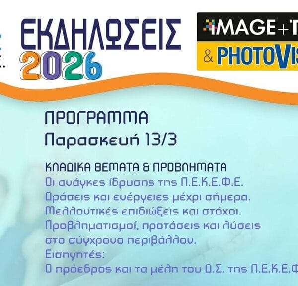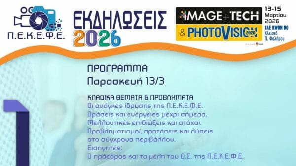 Η Πανελλήνια Ένωση Καλλιτεχνών Επαγγελματιών Φωτογράφων & Εικονοληπτών συμμετέχει στην έκθεση PHOTOVISION 2026 με ένα ξεχωριστό περίπτερο (J16). Την Παρασκευή 13/03/26 στις 18:00 θα...