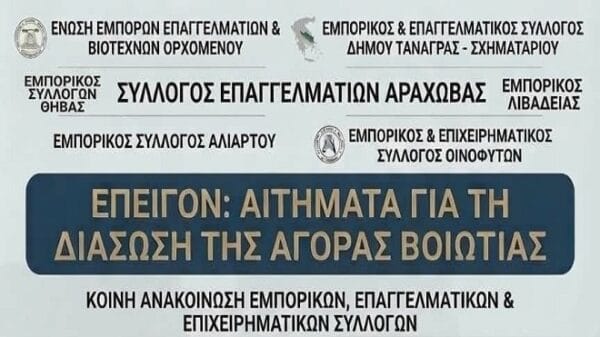 Σε μια πρωτοφανή κίνηση συσπείρωσης, οι Εμπορικοί, Επαγγελματικοί και Επιχειρηματικοί Σύλλογοι ολόκληρης της Βοιωτίας (Λιβαδειά, Θήβα, Ορχομενός, Σχηματάρι, Αλίαρτος, Οινόφυτα, Αράχωβα) ενώνουν τις φωνές...