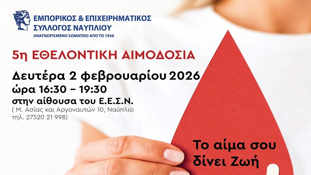 Ο Εμπορικός & Επιχειρηματικός Σύλλογος Ναυπλίου (Ε.Ε.Σ.Ν.) διοργανώνει την 5η Εθελοντική Αιμοδοσία, συνεχίζοντας μια σημαντική κοινωνική πρωτοβουλία προσφοράς. Η δράση πραγματοποιείται σε συνεργασία με το Τμήμα Αιμοδοσίας του Γενικού Νοσοκομείου Άργους και τον Σύλλογο Εθελοντών Αιμοδοτών Αργολίδας «Δεσμοί Αίματος».