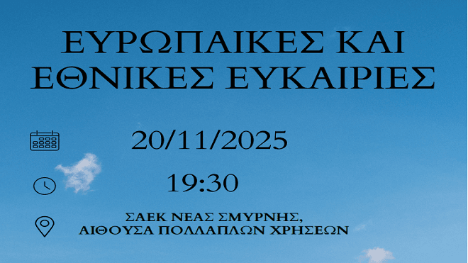 Η ΣΑΕΚ Νέας Σμύρνης, σε συνεργασία με τον Εμπορικό Σύλλογο Νέας Σμύρνης, διοργανώνει εκδήλωση την Πέμπτη 20 Νοεμβρίου, στις 19:30, στην Αίθουσα Πολλαπλών Χρήσεων της σχολής.