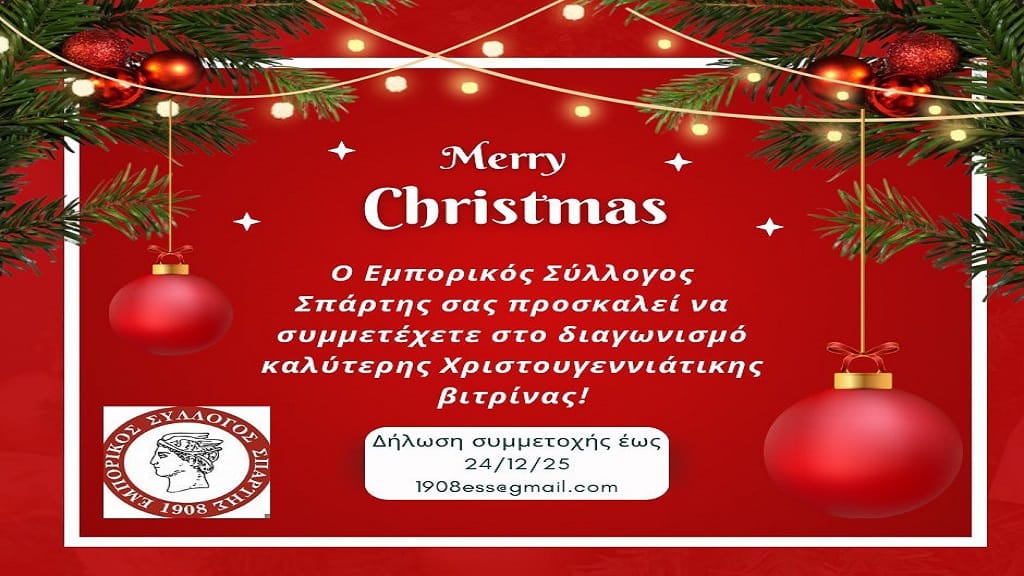 Ο Εμπορικός Σύλλογος Σπάρτης προσκαλεί όλα τα μέλη του να συμμετάσχουν ενεργά στον Διαγωνισμό Χριστουγεννιάτικης Βιτρίνας 2025. Στόχος του διαγωνισμού είναι να προσδώσει μια εορταστική, ζεστή και δημιουργική εικόνα στην αγορά της πόλης, αναδεικνύοντας παράλληλα το μεράκι και την αισθητική των καταστημάτων.