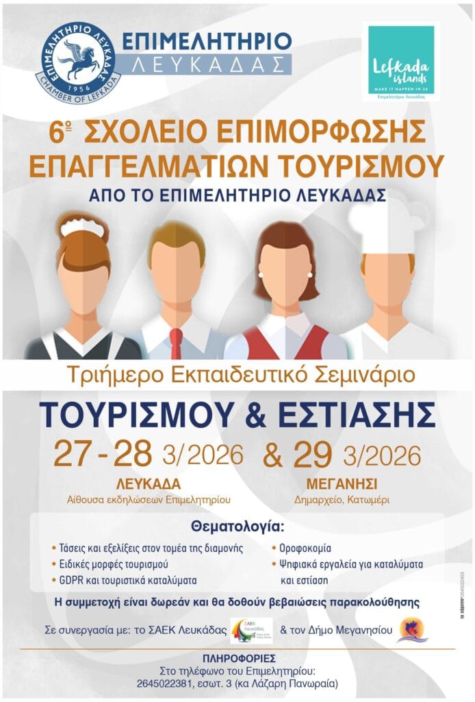 Το Επιμελητήριο Λευκάδας, πιστό στη δέσμευσή του για τη διαρκή αναβάθμιση του τουριστικού προϊόντος του νομού, ανακοινώνει τη διεξαγωγή του 6ου Σχολείου Επιμόρφωσης Επαγγελματιών. Η δράση, που αποτελεί πλέον θεσμό για την τοπική αγορά, θα πραγματοποιηθεί στις 27, 28 και 29 Μαρτίου 2026, καλύπτοντας γεωγραφικά τόσο τη Λευκάδα όσο και το Μεγανήσι.
