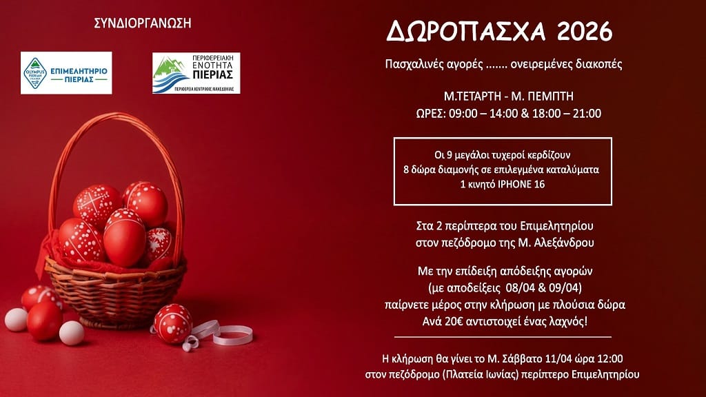 «ΔωροΠάσχα 2026» στην Πιερία: ψωνίζεις τοπικά, κερδίζεις iPhone 16 και ονειρεμένες διακοπές!