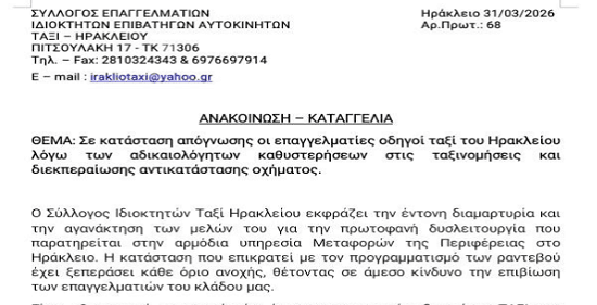 Με μια σκληρή ανακοίνωση-καταγγελία, ο Σύλλογος Ιδιοκτητών Ταξί Ηρακλείου εξαπολύει επίθεση κατά της Διεύθυνσης Μεταφορών της Περιφέρειας Κρήτης. Οι επαγγελματίες αυτοκινητιστές περιγράφουν μια χαοτική...