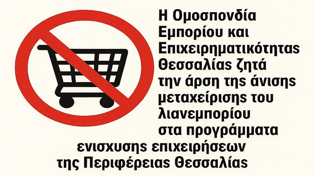 Η Ομοσπονδία Εμπορίου και Επιχειρηματικότητας Θεσσαλίας ζητά την άρση της άνισης μεταχείρισης του λιανεμπορίου στα προγράμματα ενίσχυσης επιχειρήσεων της Περιφέρειας Θεσσαλίας