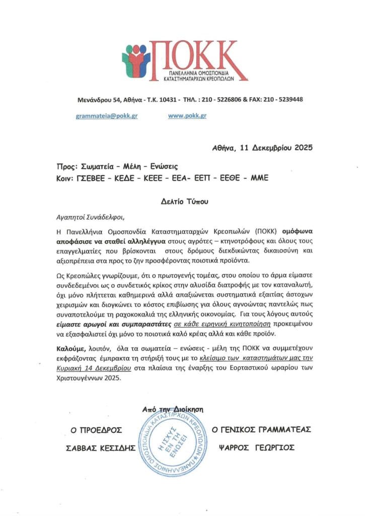 Η ΠΟΚΚ απηύθυνε κάλεσμα προς τα σωματεία μέλη της και τους κρεοπώλες πανελλαδικά να κρατήσουν τα καταστήματά τους κλειστά την Κυριακή 14 Δεκεμβρίου. Η κίνηση αυτή αποτελεί ένδειξη στήριξης, δεδομένου ότι την ημέρα αυτή τα εμπορικά καταστήματα λειτουργούν λόγω εορταστικού ωραρίου.