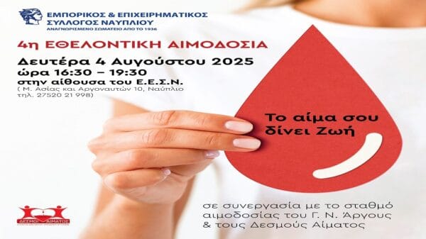 Ο Εμπορικός & Επιχειρηματικός Σύλλογος Ναυπλίου διοργανώνει την 4η Εθελοντική Αιμοδοσία σε συνεργασία με το Τμήμα Αιμοδοσίας του Γενικού Νοσοκομείου Άργους και τους «Δεσμούς...