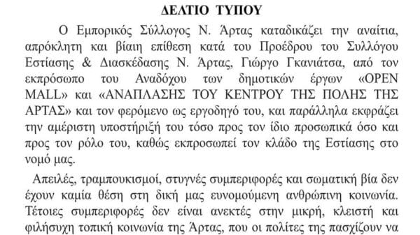 Ο Εμπορικός Σύλλογος Ν. Άρτας αποδοκιμάζει το γεγονός της επίθεσης προς τον Πρόεδρο του ΣΕΔΑ και καταδικάζει το γεγονός της επίθεσης, καλώντας παράλληλα το...