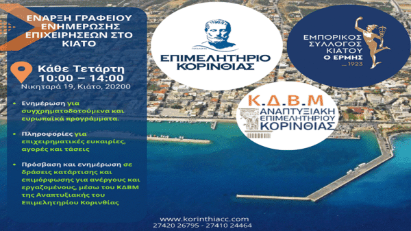 Το Επιμελητήριο Κορινθίας, σε συνεργασία με τον Εμπορικό Σύλλογο Κιάτου “Ο Ερμής”, ανακοινώνει τη δημιουργία Γραφείου Ενημέρωσης Επιχειρήσεων στο Κιάτο, με στόχο την ενίσχυση της επικοινωνίας και...