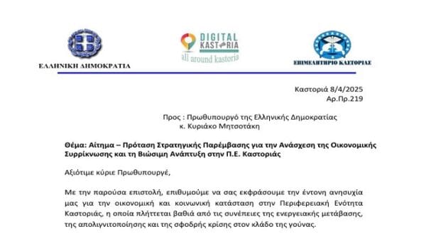 Το Επιμελητήριο Καστοριάς, στο πλαίσιο του θεσμικού του ρόλου για την ενίσχυση της επιχειρηματικότητας και της βιώσιμης ανάπτυξης, κατέθεσε επιστολή προς τον Πρωθυπουργό της...